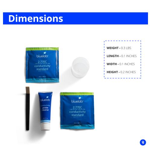 • 20 ml di soluzioni monouso Bluelab Solution, 2 ciascuno di: pH 7.0 e pH 4.0, KCl, 2.77 EC